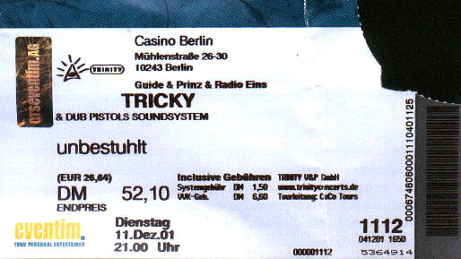 here's my review: My expectations for this show were not very high (after reading a couple of negative reviews and having seen Tricky already in July), so i was totally surprised how great this show was! Some things were the same as always (dark stage, energy, thanks you very very very much), but some things definitely different. The show started with an Intro which could have been the new b-side "What's it gonna be" by Ko-La, but I'm not sure (I must admit that the whole memory of this show is a bit of a blur in my mind, because it's been now three weeks ago). Then a new song that repeats the line "It's just a question" or something like that very often, typical Tricky-mantra-style. The first thing I noticed that was different from previous shows is the more rock-sound and rock-onstage-behaviour. No more backs to the audience or wild shaking, Tricky was standing with his side to the audience, moving his hands on the mic like Björk often does. Also the development in the songs seemed different to me. He played a lot of long and more intense versions of songs, like always ("Money Greedy" was one of the highlights). But this time there were more contrasts in the songs, loud parts changed with more silent parts with Tricky whispering, and lots of echoes. Also "For Real" was played in a longer, different version that was really good. I was also surprised about the better version of "Hot like a sauna", which is normally my favorite candidate to get skipped on CD. I didn't care so much about the slow songs like "Pumpkin" or "Overcome", especially since the new singer was not very good and seemed insecure. But mostly her voice was hardly heard anyway, so..... Hawkman was very good, and the audience liked him, but he didn't sing much this time. As soon as I got in the right mood (probably at the time where "Hot like a sauna" was played) the time passed very quickly and the band already left the stage. They just played one encore, the typical long "Vent" version, and then left again. I was a bit disappointed by the short time they played (or maybe I just lost the right feeling for time and space), but all in all it was again a great show and I'm glad I decided to pay the high price for the ticket. Tricky was