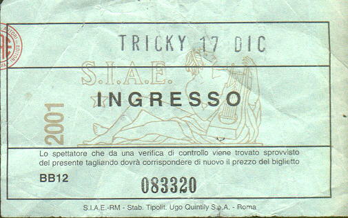 see a photo here here's a review from Giuseppe: This was my second Tricky concert, the first was just this summer in Rome too; also I've seen a lot of videoclips of Tricky's live performance, so I knew very well what I was going to see. The show of this summer impressed me a lot, so when I read that he will come back in Rome, I decided to see the concert another time. The show took place in a very little indoor stadium, a friend of mine told me they use it for the five-a-side football, and when I came in I thought it was perfect for a concert like that, in fact when the show began the stadium was full, I was quite close to the stage but I had all the space that I needed. The concert was opened from a band of two rappers from Los Angeles (so they said), after the first song I thought they weren't very bad, but after four or five songs I'd like to have a gun, to go up to the stage and to use it: I hate that kind of rap songs that repeat always the same words for thousands times (the top was "motherfucker put your hands up"). Fortunately after about half an hour they stopped to insult us and Tricky began his performance: I didn't know that song but it looked me very nice, Tricky wasn't at his best but it was just the first song of the show, the other player instead played immediatly in a fantastic way, this summer they weren't so powerful, also the drummer played "Sonor" drums and I think there are no drums like that; the sound was fantastic, I was only waiting for Tricky's wakin' up. Somebody told