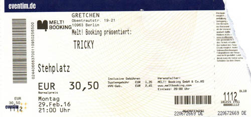 See some photos at laut.de. Watch parts of the show on You Tube. Read a review here (in German).Here's my (short) review: The show was really good in my opinion (not as good as the live shows used to be from 1996 to 1999, but still very good)! Tricky seemed to be in a good mood, thanking the audience a lot and in between two songs he said something about living in Berlin now and so playing at home today! Also his vocals were loud and good to hear, not always a given lately! Luke Harris on drums and Paul Noels on guitar were also good and they can sing very well. The only things that bothered me was mostly the shortness of the gig. It was over so fast, and ended after the best song: a great, long and intense version of Vent. The audience was really nice and in a good mood, that's why I was surprised that Tricky didn't play longer (because my impression is that Tricky's mood depends on the audience). I really wished the concert would have gone on after Vent, but ok. Also it was a bit lame that the female vocals came from a laptop. I don't really like the fact that he's not touring with a female singer this time. It just makes a difference and would be more intense and more "natural" to have a female singer, and a whole band for that matter. Maybe it's too expensive? What a pity... But other than that I really enjoyed the show! They played mostly songs from Skilled Mechanics (of course), even starting with the first two songs from the album in the exact order. I didn't care much for the slower songs like "Diving Away" or "Overcome", although "Makes Me Wanna Die" was very good (sung by Paul Noels, I think, I couldn't see much, maybe I should wear high heels next time!). I always prefer faster songs with more energy, so the best tracks in my opinion were "Here my dear", "Palestine Girl" (very intense live), "Vent" of course (always my favorite) and "Sun Down", most of these were played longer than on the album. I was shocked that they already left the stage after 60 minutes, but then I thought about other concerts, where the second half was almost as long as the first and not just the usual encore. But unfortunately not today. They came back with "Here my dear" (for the second time), this time people were allowed to go on stage. I didn't expect that (and unfortunately I wasn't right in the front), because he doesn't play "Ace of spades" anymore. So all in all it was good, but not extraordinary or special. But maybe I'm spoiled because I have seen too many great Tricky concerts :) PS: I'm not exactly sure when Beijing To Berlin was played, but it was definitely played... PPS: support act was Kiko King And Creative Maze, who announced that they are on Tricky's False Idols label! They have some photos and videos backstage with Tricky on their Facebook page.