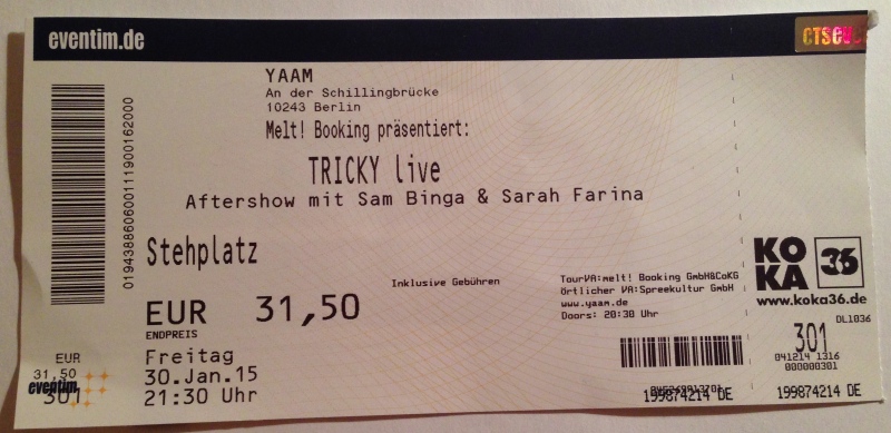 Here is my review of the show: Lately Tricky concerts can be very good or very bad, depending on his mood. We were very lucky that day, because obviously he was in a good mood! Tricky did a lot of vocals, a lot more than last time, and also his mic was loud enough that you could hear him! It's not always like that. All in all he seemed very focussed, not one song was aborted. The band was good, although I missed a bass and keyboard player, it was just Tristan on guitar and Luke Harris on drums (at least I think so, he was hard to see). The new singer K Bleax did a good job, although her voice isn't as good as Francesca's, so I missed her a bit. Also she seemed a bit stiff and uncomfortable on stage, but maybe it will get better with time, this was only her third show with Tricky. The show started with 'When you go' while the band went on stage, then the usual 'You don't wanna' Instrumental. The first song was the unreleased 'I live alone' which I always like, because it has a good energy, although Francesca can sing it better. Puppy Toy was really great, then after some songs I was really surprised they played 'Lonnie Listen', because Mykki Blanco is so special on it that I thought he's impossible to replace. But K Bleax did his part and it was quite good. Unfortunately Tricky didn't do his first verse. The first highlight was 'My Palestine Girl', it was very intense and played longer than on the album (I think). The following 'Why don't you' was good, I was surprised that K Bleax can do the rap part really good. I would have preferred to hear 'Gangster Chronicle', but unfortunately they didn't play it. Also the usual 'Ace Of Spades' with stage invasion wasn't played this time! The only time people could go on stage was during 'By myself', but the stage was really dark during the song. In general the stage was really dark during the second half, at first there a lot of lights and almost a light show, which obviously Tricky didn't like, so after a comment he made the lights were darker. 'Overcome' and 'Black Steel' were the only songs with no vocals by Tricky, but at least he didn't leave the stage but stayed in the back. My favorite song was 'Sun Down', which was played in a longer and more intense version with no female vocals (as far as I remember). After a short break the band came back for two encores, which were played really long (about 30 minutes): first Vent and then 'By Myself'. All