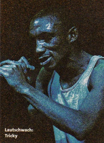 TRICKY MACHT MUSIK DER ATMOSPHÄRE halber. Und weil er die Welt offensichtlich als einen ebenso verkniffenen wie feindseligen Ort empfindet,fallen seine oft arhythmischen und disharmonischen Klangsphären eben entsprechend klaustrophobisch und düster aus. Das kann man nun toll finden oder auch ganz furchtbar — jedenfalls aber darf Tricky auf die volle Unterstützung aller Fans waghalsigen mutiger Musik zählen. Der Übergang von DJ-Musik zu Band funktio- niert heute abend praktisch bruchlos. Plötzlich wird man sich bewußt, daß die Musik mit richtigen Instrumenten gemacht wird - Drums, Bass, Keyboard und Gitarre. Und dann wird man des dürren Teufelchens gewahr, das sich vorn links auf der Bühne um seinen eigenen Oberkörper windet, als müsse es ein Uhrwerk im Bauch aufziehen. Wie ein Berser- ker zuckt und windet sich Tricky ums Mikro- phon und stößt da bei pausenlos hypnotische Phrasen hervor, aus denen hin und wieder wie ein Dorn ein verständliches Wort herausragt. Die zur Schau getragene Psychose wirkt zunächst recht unterhaltsam und irgendwie | relevant. Nach maximal einer halben Stunde aber ist die Erwartungshaltung verpufft, in den hinteren Rängen lenkt man sich mit gemütlichem Plaudern ab. Das Problem liegt in der frustrierenden Lautschwäche der Musik: Die Band schwitzt, prügelt und groovt redlich, doch was beim Publikum ankommt, ist nur ein laues Lüftchen. Daß Martina und Cath Coffey mit dem Habitus von Schlafwandlern über die Bühne schlurfen und auch entsprechend singen, macht die Sache nicht besser. Unter diesen Umständen wirken selbst Klassiker wie „Black Steel” und „Ponderosa” zahnlos. Das großzügige Programm gerinnt alsbald zur eintönigen Tortur. Viel zu spät, erst bei „Christi- ansands”, dem letzten Song des regulären Sets, wird es doch noch wohlig bedrohlich. Bei der Zugabe „Tricky Kid" schließlich stürmen zwei Rapper von Trickys London-Posse auf die Bühne und versprühen endlich die Funken, auf die die Besucher so lange gewartet haben. Sie sprühen noch zwanzig Minuten weiter - gerade lange und böse genug, daß man wohl auch das nächste Tricky-Konzert wieder mit gewisser Spannung erwarten wird. (hpk) |