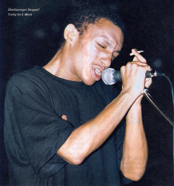 Er sei zwar müde, aber gut gelaunt, erklärte Tricky noch eine Stunde vor Konzertbeginn im total ausverkauften Kölner E-Werk. Wie sich das in seiner Live-Performance äußere? Da tanze er immer so ausgelassen... Als Tricky schließlich, begleitet von Sangespartnerin Martina sowie vierköpfiger Band, die Bühne betrat, war von dem versprochenen Ge- tanze nicht viel zu sehen. Zum einen verbrachte Tricky den Großteil des 60minütigen Auftritts mit dem Rücken zum Publikum stehend, zum anderen hatte die eigenwillige TripHop-Diva alle Lichter auf der Bühne ausknipsen lassen und so sah man vor allem eines: Dunkelheit. All das hätte nun noch kei- ne Katastrophe dargestellt, wenn nicht der Sound so grottenschlecht gewesen wäre. So aber ent- wickelte sich das Konzert, das ursprünglich den Höhepunkt der diesjährigen PopKomm darstellen sollte, zum Eklat. Tricky freilich schien das nicht weiter zu stören. Trotzig spielte vor allem unbe- kanntes, neues Material seines eher sperrigen neu- en Albums ‘Pre-Millenium Tension’ und Songs der bereits fertiggestellten darauffolgenden Platte, die vielleicht irgendwann Mitte des nächsten Jahres einmal veröffentlicht wird. Und wenn dann gele- gentlich doch ein bekannter Song angespielt wurde, bemerkt man das oftmals lediglich an einer Textpas- sage oder einem charakteristischen Sound-Sample. Ob das nun an Trickys eigenwilliger |nterpretation, |